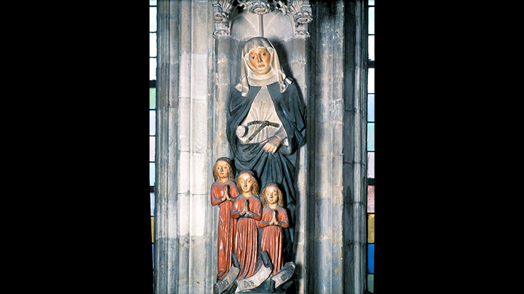 Der Dom kann uns dabei ein wenig helfen. Hoch oben an der Nordwand des Langhauses, gegenüber dem zweiten und dritten nördlichen Langhauspfeiler, begegnet uns die hl. Sophia mit ihren drei Töchtern Fides, Spes und Caritas – Glaube, Hoffnung und Liebe – personifiziert. Ihre Mutter Sophia, eine wohlhabende christliche Witwe aus Mailand, überließ den ganzen Reichtum ihres verstorbenen Gatten den Armen und zog mit ihren Töchtern nach Rom, wo sie, der Legende nach, gemeinsam mit diesen in der Christenverfolgung Kaiser Hadrians (117–138) das Martyrium erlitt und später zusammen mit ihnen als Heilige verehrt wurde. Die Namen der drei Töchter wurzeln in den drei göttlichen Tugenden Glaube, Hoffnung und Liebe und erinnern an das Hohe Lied der Liebe (1 Kor 13, 12-13), wo es heißt: „Nun aber bleiben Glaube, Hoffnung, Liebe, diese drei.“ Wenn auch die Historizität ihrer Leidensgeschichte nicht belegt ist, wurde diese doch in viele Sprachen übertragen, und ab dem 6. Jahrhundert ist ihre Verehrung in Rom bezeugt.