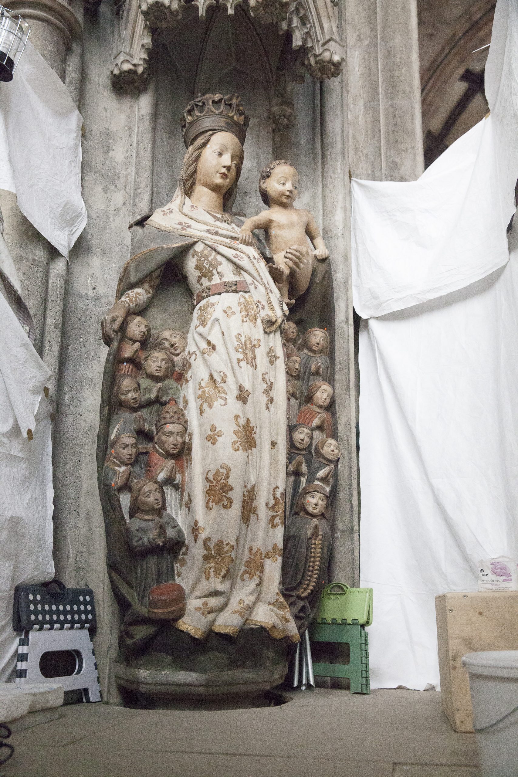 Ja, den gibt es: die Schutzmantelmadonna im nördlichen Seitenschiff. Zu meinem letzten runden Geburtstag, der schon ein paar Jahre her ist, wurde ich von Familie, Freunden und Bekannten gefragt, was ich mir wünsche. Dabei entstand die Idee zum Spendenaufruf, also zur Sanierung der Schutzmantelmadonna beizutragen – anstelle eines Geburtstagsgeschenkes. Das hat sehr gut funktioniert. So gut, dass ich heute noch Fotos bekomme von Menschen aus meinem persönlichen Umfeld, die im Stephansdom sind und die Schutzmantelmadonna „besuchen“.