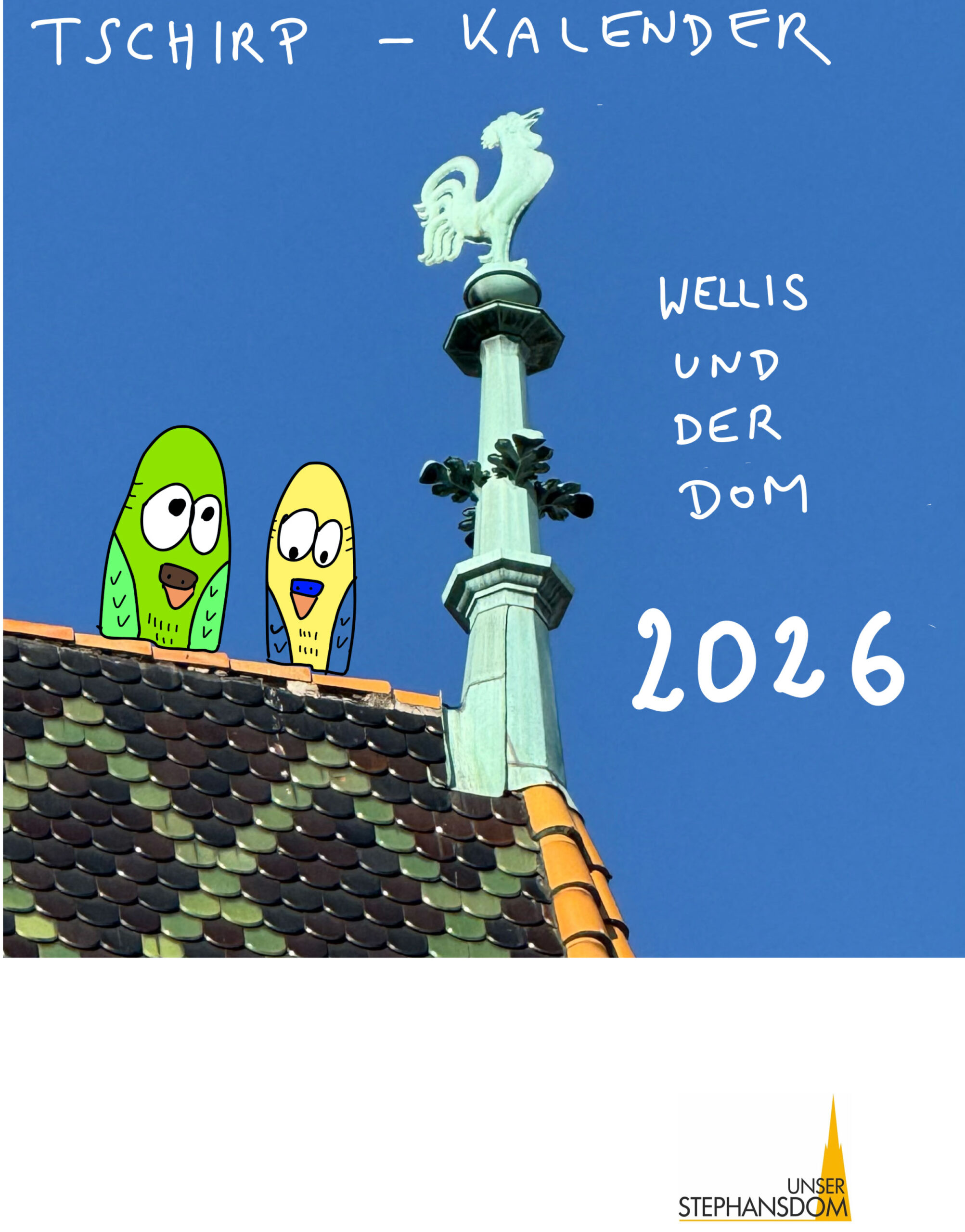 Die Wellensittich-Cartoons rund um den Stephansdom zaubern Ihnen Monat für Monat ein Schmunzeln ins Gesicht. Der Erlös des Kalenders „Wellis und der Dom“ kommt zur Gänze dem Verein „Unser Stephansdom“ zugute.